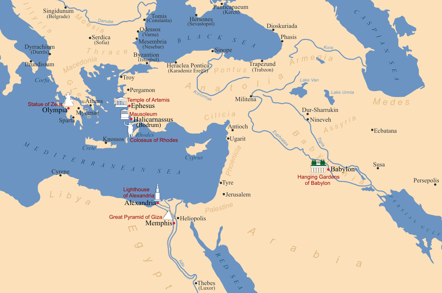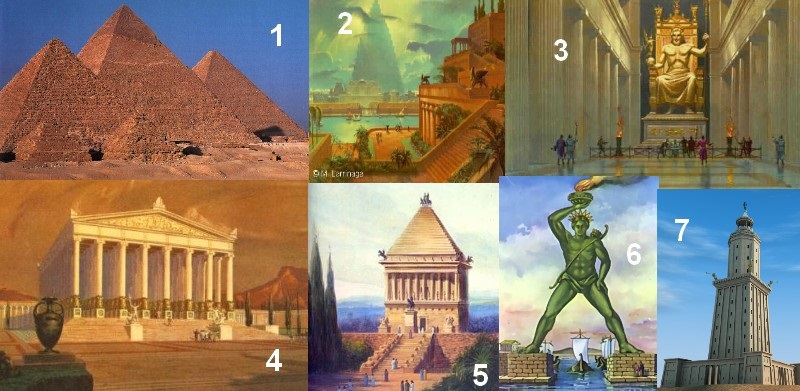 Dans l’ordre, on devrait avoir les jardins suspendus de Babylone en premier car si les pyramides de Gizeh correspondent à priori à la civilisation égyptienne des pharaons, l’arrivée de l’humain sur ces terres (probablement depuis la mer rouge) est beaucoup plus tardive que la civilisation mésopotamienne (depuis le golf persique).